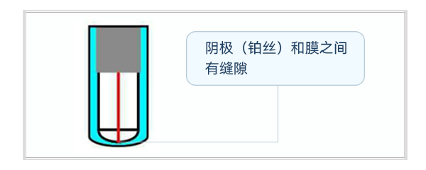 检查溶氧膜膜片,如果有过度的突起,如下图示,使阴极不能接触到膜片,则必须更换溶氧膜。